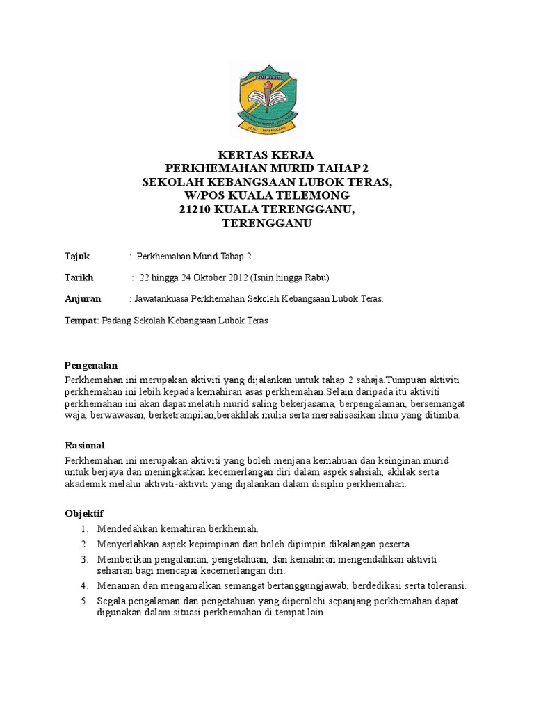 KERTAS KONSEP PERKHEMAHAN BADAN BERUNIFORM SEKOLAH SEKOLAH KEBANGSAAN TITI TOK BANDAR PERLIS 2012 1. Check Pages 1 - 8 of KERTAS KERJA PERKHEMAHAN 2017 in the flip PDF version. KERTAS KERJA UNTUK PROGRAM MINGGU BAHASA MELAYU 2011 10 PENDAHULUAN Selaras dengan Dasar Pendidikan Kebangsaan yang termaktub dalam Akta Pendidikan 1996 Bahasa Melayu ialah mata pelajaran teras di semua sekolah rendah dan menengah.